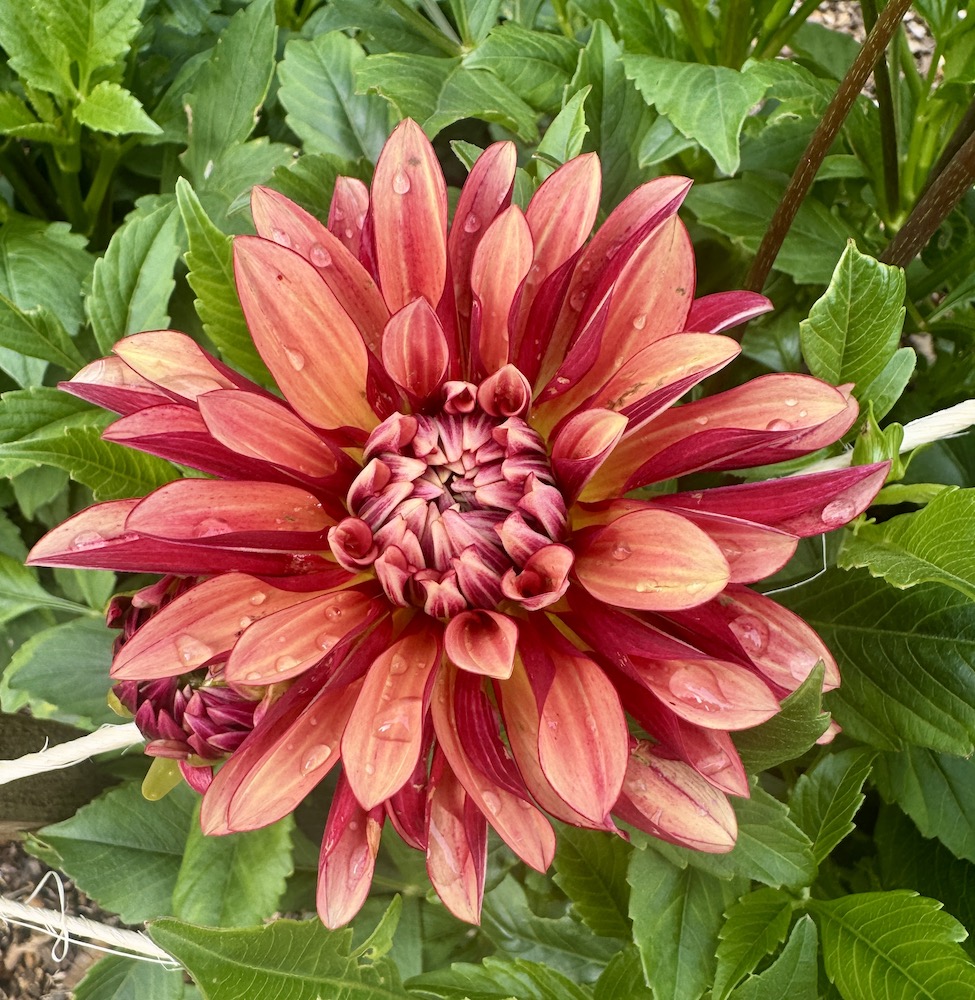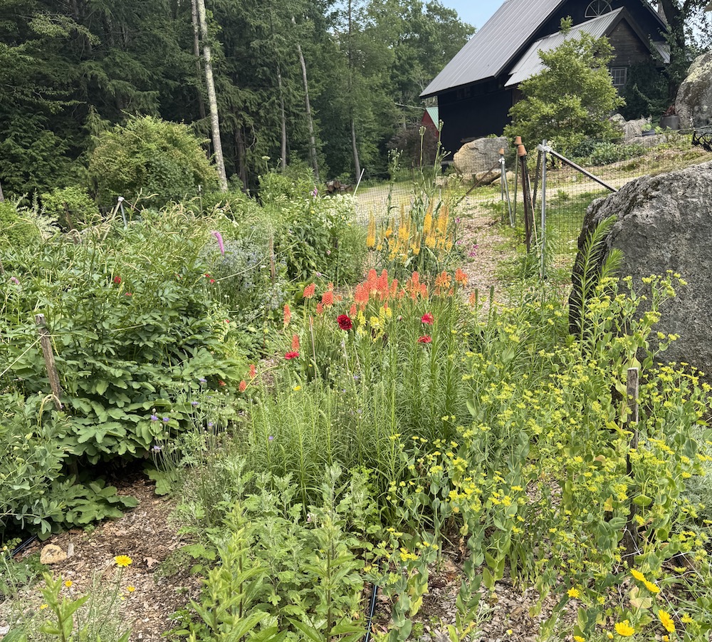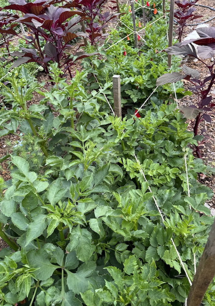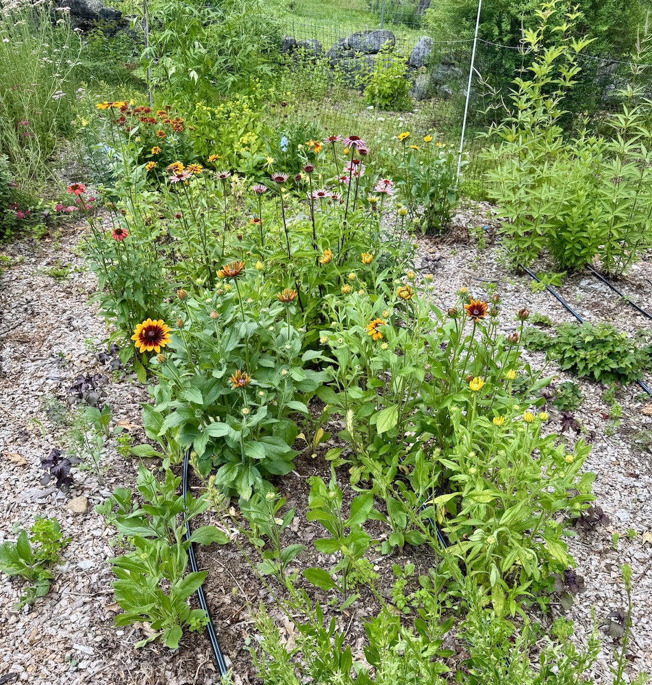Besides creating with flowers I have been working on my to do list…one patch of yarrow has been cut down, don’t worry, there is still a patch of first year plants, and finally the dahlias have their second corralling. It looks like that rope game that we used to do as kids, or a spiders web.