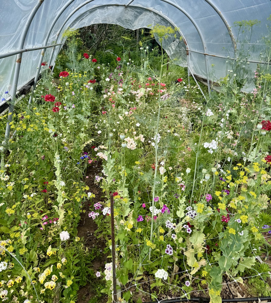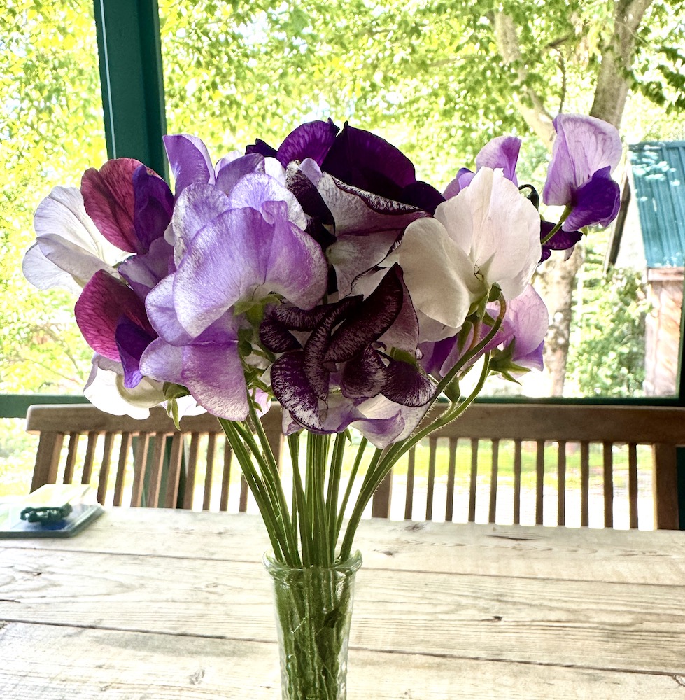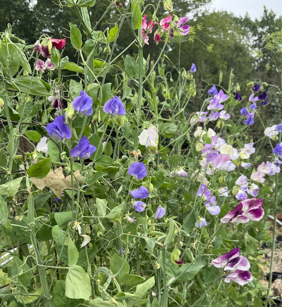 I also have to show you the sweet peas that I’m not growing this year. If you love sweet peas, whisper into my ear and I will cut you some, but they aren’t for general sale. Only for sweet pea lovers. The perfume of a jarful of sweet pea blossoms makes up for their short vase life, but oh, it is so worth it.