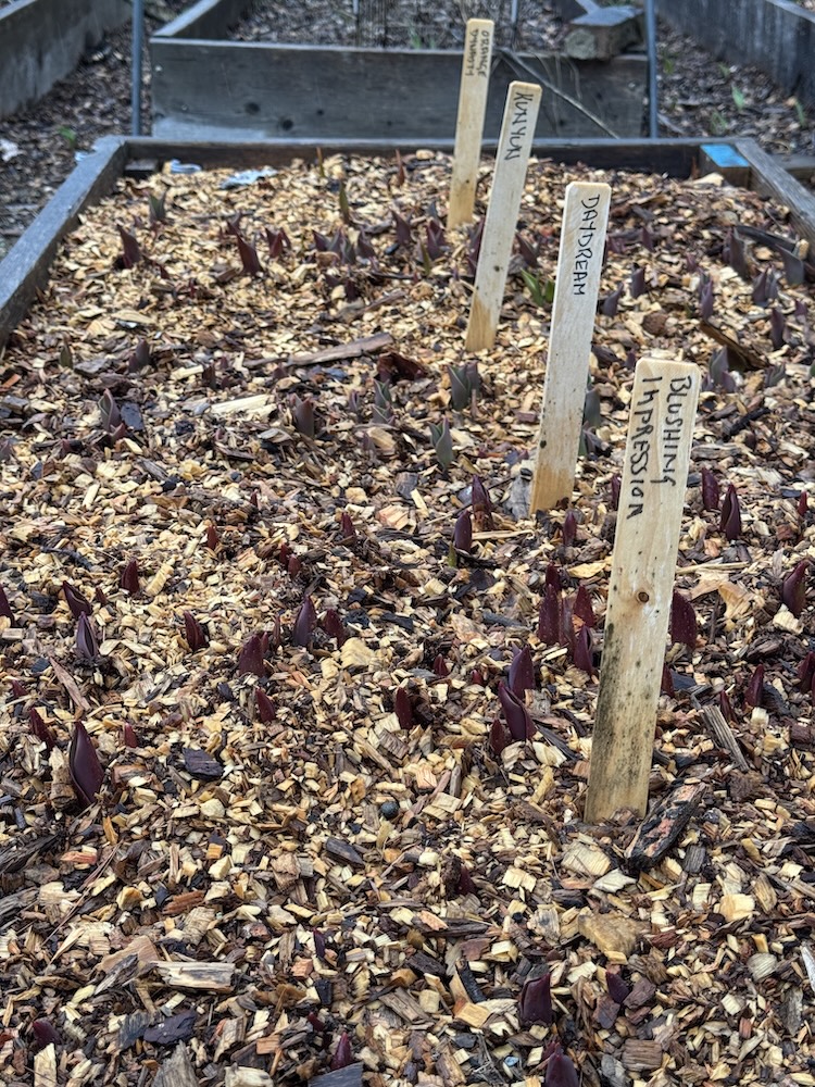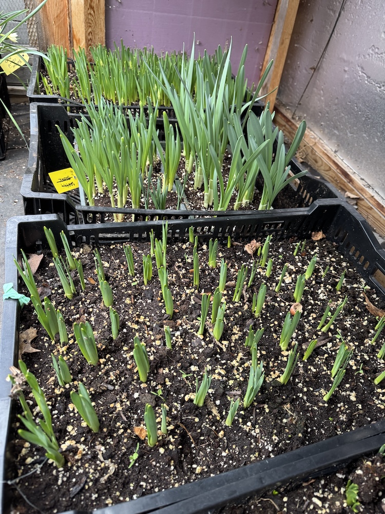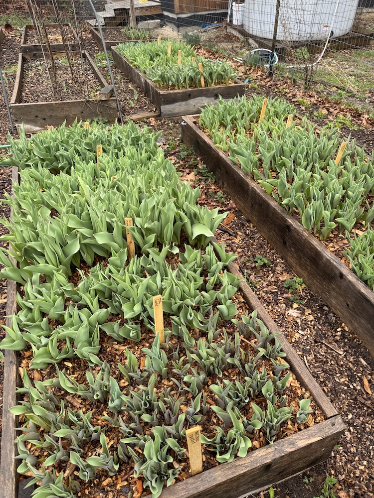 Anyway, onwards and upwards. Just about everything that was ordered in the cold dark winter days has been planted out, except the roses that have already leafed out and the hydrangeas that came fully leafed out. They have been pulled into the dirty room for the next few nights. It is a good thing all the tulips crates are out now.
