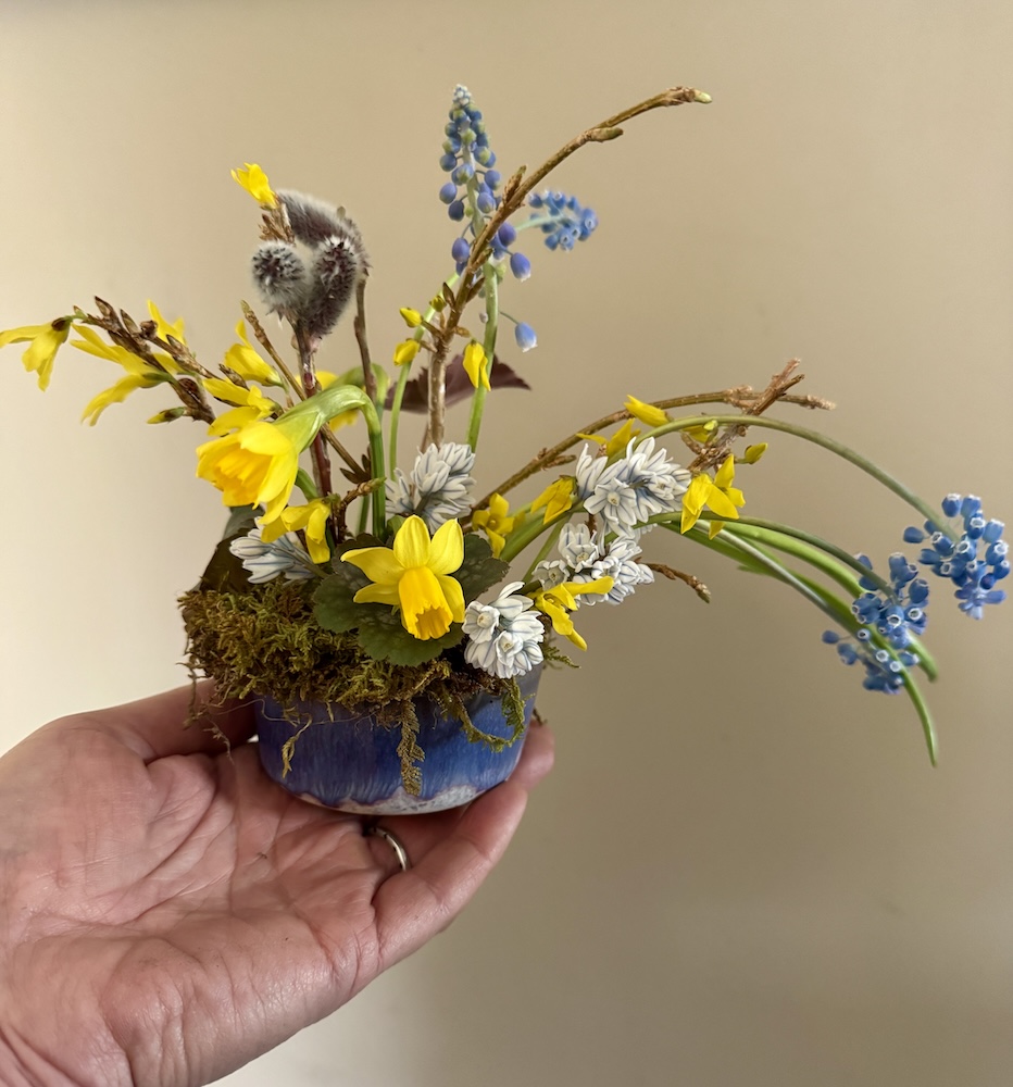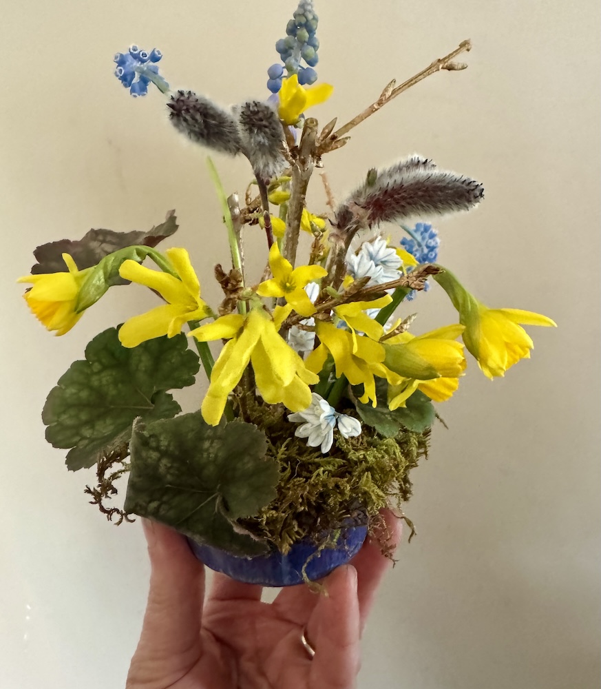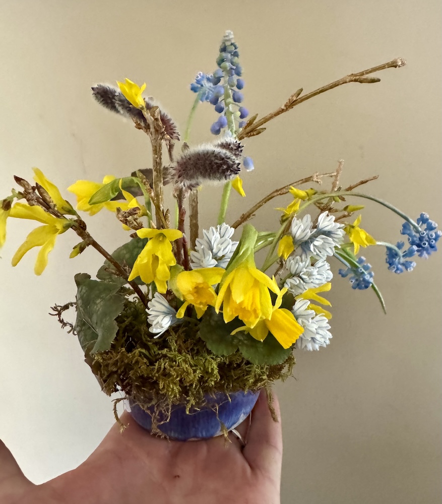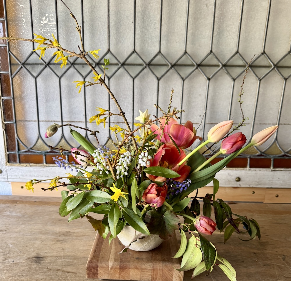 All held together with a hairpin holder and chicken wire. I just love how those Caro tulips open up and change color.