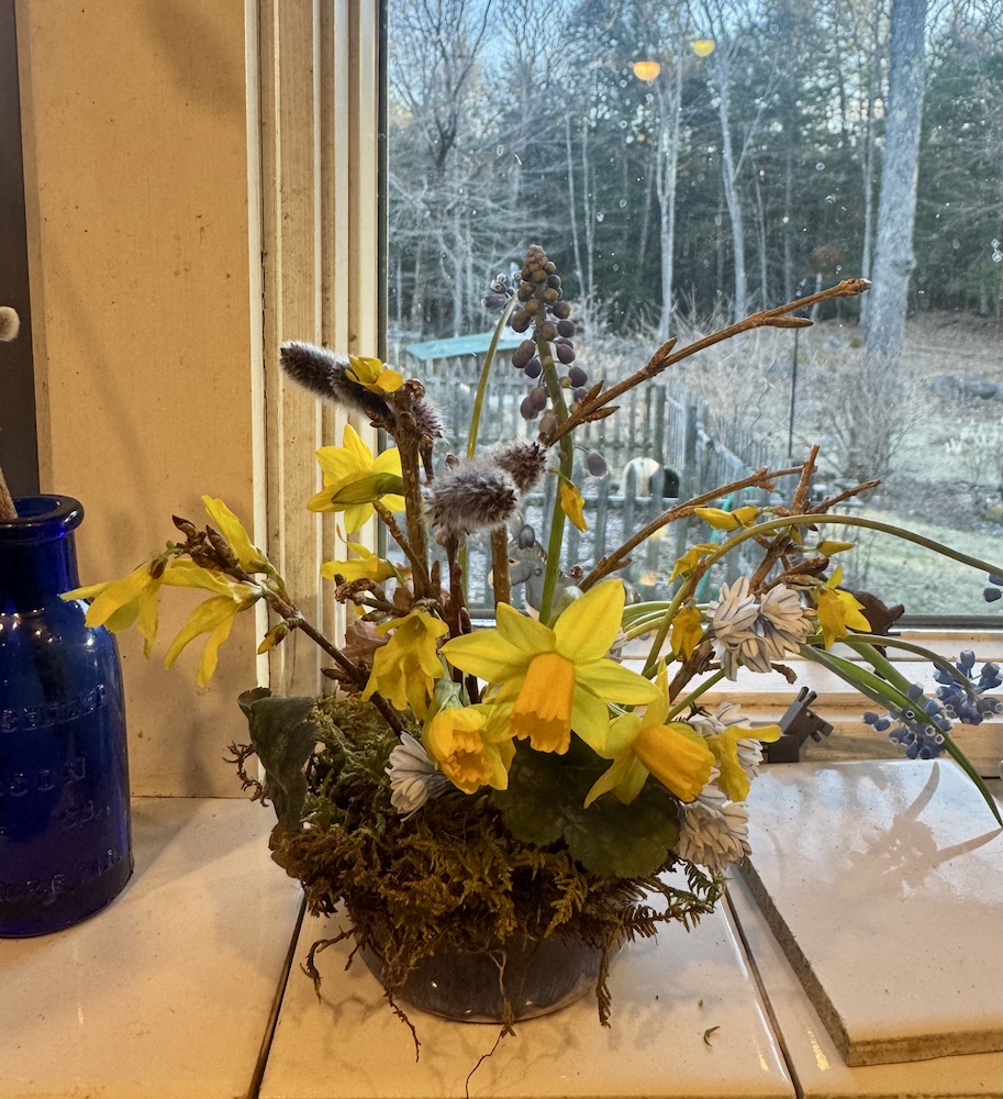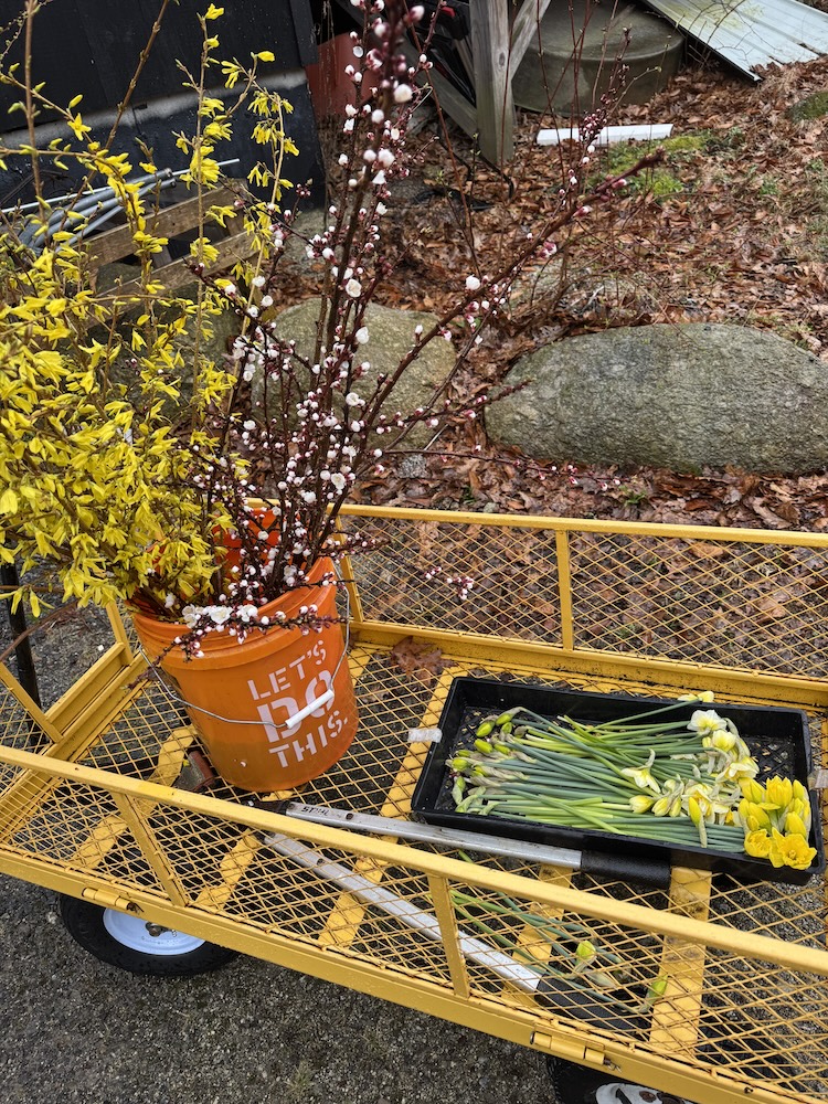 This afternoon I went out in the rain and harvested the flowering nectarine branches that would defently be black by the morning, the forsythia and the spirea that is just breaking bud. I also harvested every narcissus that was a goose neck stage to put in storage.